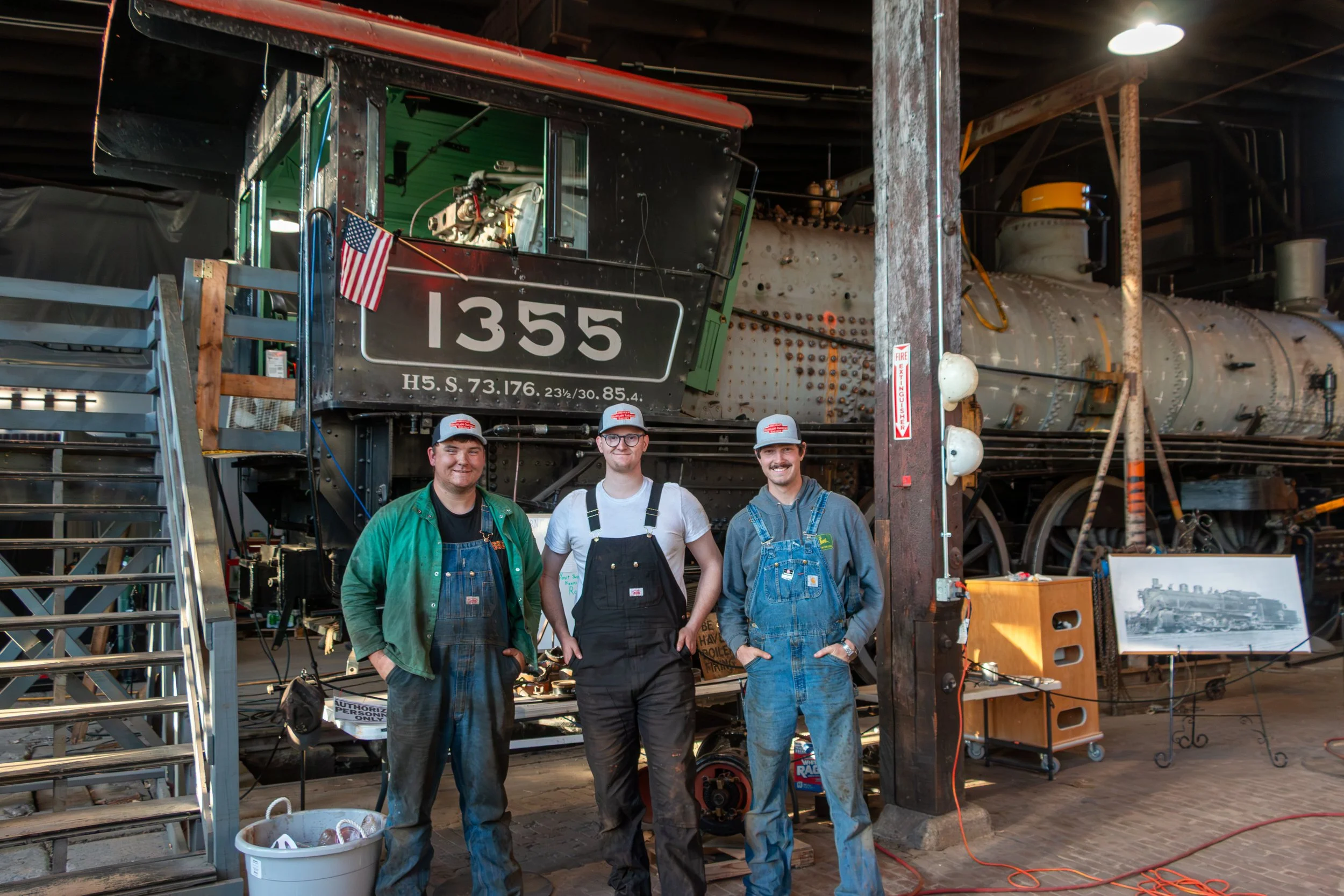 RDG steam services contractors (Left to Right) Grayson Littleton, Caden Adams, Kevin Palzynski stand proudly infront of Great Northern Locomotive #1355 in Sioux City, IA